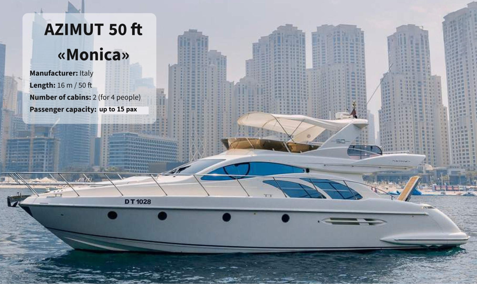 The Azimut 50ft "Monica," manufactured in Italy, offers an exquisite charter experience, perfectly balancing the ability to host up to 15 passengers (pax) for a day cruise with the intimacy of two cabins capable of sleeping four guests overnight. This $16~m/50~ft$ yacht boasts a comfortable main salon with light leather seating , a shaded flybridge with a social dining area , and a luxurious master suite featuring a distinctive rounded bed . We are confident that "Monica" provides an unparalleled environment for celebrating any occasion, and we invite you to be among the first to charter this premium vessel and share your valuable review, helping to showcase its Italian elegance and superior comfort to future guests.