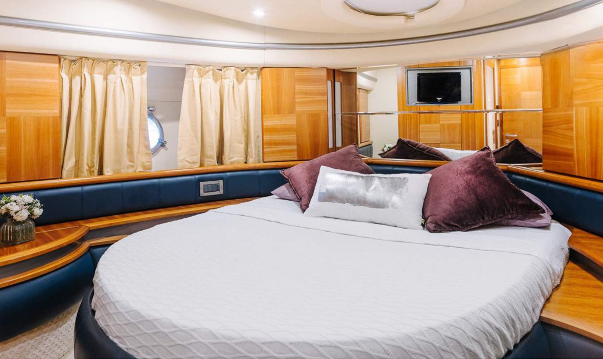 - Master Suite Comfort: The yacht provides two cabins, including a master suite that features a unique, luxurious rounded bed surrounded by elegant wood paneling and curtains , ensuring a restful night for overnight guests.
